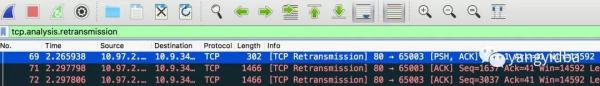 (1)在遇到丢包重传的机器上抓包并使用wireshark 分析该包,注意因为重传不是时刻都有的,所以抓包命令是要持续执行以便捕捉到重传的包。使用wireshark打开tcpdump的结果,在搜索框里入手tcp.analysis.retransmission 得到如下结果: