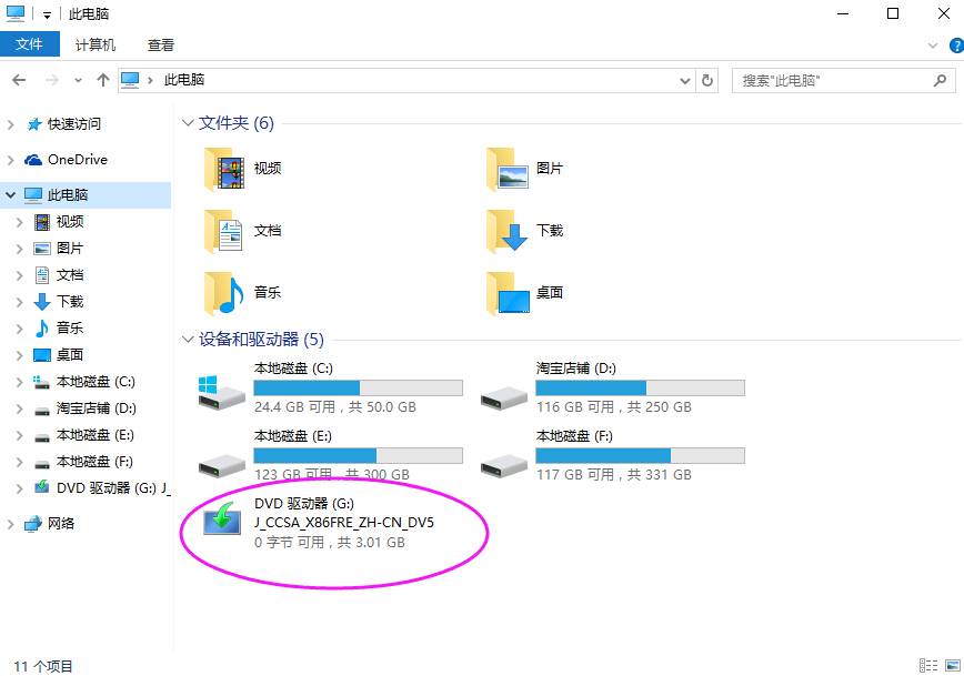 这样的目的就是就是把原版iso系统加载到虚拟光驱,如下图所示,你电脑中就多了个分区。(我的电脑中多了个G盘)