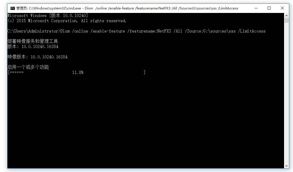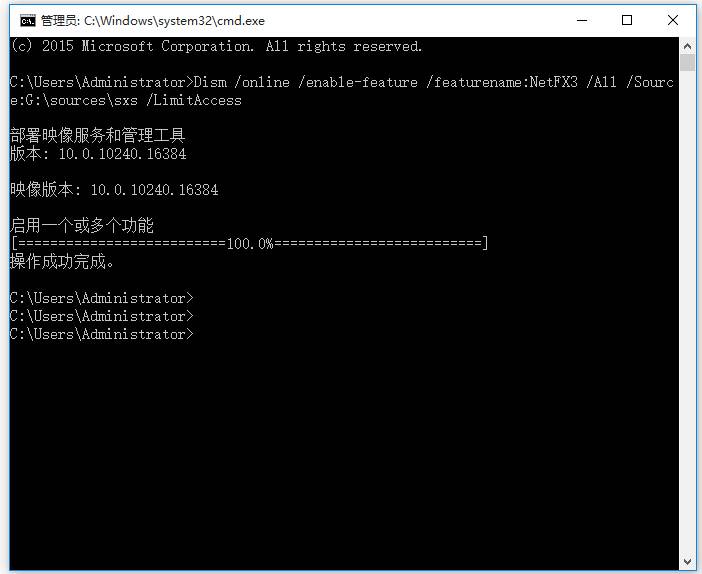 上面这段命令中的Source:G:的G盘是根据你具体的情况分的,就是比如你有原来有CDE三个盘,那么加载的就会是E盘 就写Source:E,想我的电脑之前是有CDEF四个盘的,加载后的虚拟光驱是G盘,所有上面就填写G盘。然后回车键确认 如果下图所示,等到提示安装到100% 的时候win10 net framework 3.5就安装成功了,这种方法最简单了。