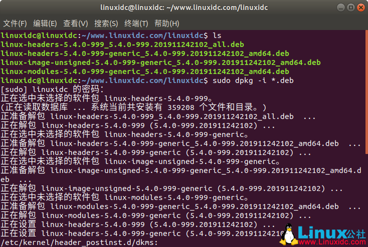 cd //home/linuxidc/www.linuxidc.com/linuxidc wget -c https://kernel.ubuntu.com/~kernel-ppa/mainline/daily/2019-11-25/linux-headers-5.4.0-999_5.4.0-999.201911242102_all.deb wget -c https://kernel.ubuntu.com/~kernel-ppa/mainline/daily/2019-11-25/linux-headers-5.4.0-999-generic_5.4.0-999.201911242102_amd64.deb wget -c https://kernel.ubuntu.com/~kernel-ppa/mainline/daily/2019-11-25/linux-image-unsigned-5.4.0-999-generic_5.4.0-999.201911242102_amd64.deb wget -c https://kernel.ubuntu.com/~kernel-ppa/mainline/daily/2019-11-25/linux-modules-5.4.0-999-generic_5.4.0-999.201911242102_amd64.deb sudo dpkg -i *.deb