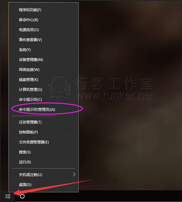 首先鼠标右键点击电脑左下角windows图标,然后选择【命令提示符(管理员)】,如下图所示。