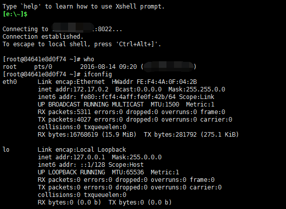 docker exec -ti test /bin/bash [root@84641e8d0f74 /]#passwd #修改容器中centos系统ROOT账户的密码 [root@84641e8d0f74 /]#yum -y install openssh* #安装openssh服务 [root@84641e8d0f74 /]#service sshd start