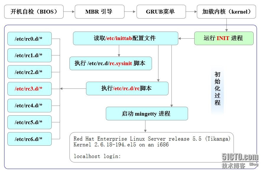 Linux操作系统的引导过程:开机自检→MBR引导→GRUB菜单→加载Linux内核与内存文件系统→加载硬盘驱动以及初始化进程。