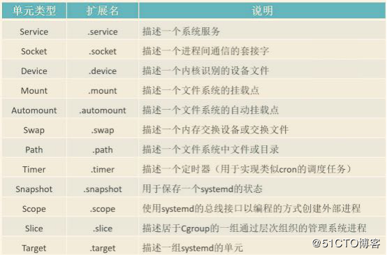 在systemd中不同类型的systemd对象被统一称为单元,是让系统知道如何进行操作和管理资源的主要对象,所以systemd有许多单元类型。