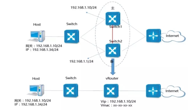正常情况下,主设备负责转发数据流,当主设备出现故障时,会选择备组里优先级较高的设备作为主设备继续负责转发数据,实现网关冗余备份,同时达到链路冗余功能。