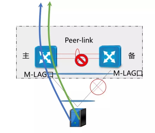 3.广播流量会经过peer-link,peer-link与双归的M-LAG成员口是单向隔离的(peer- link进的流量,不可以从M-LAG相应的成员口出)。