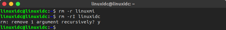 该 -i 选项告诉 rm 提示您确认删除每个子目录和文件。如果目录包含大量文件,这可能有点烦人,因此您可以考虑使用 -I 在继续删除之前只提示您一次的选项。