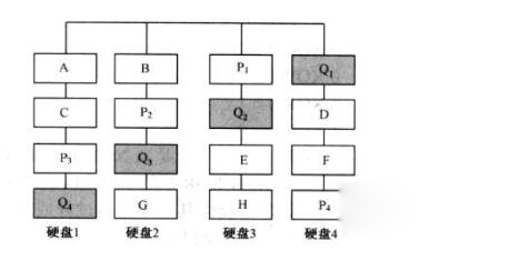 3、如果某个条带中丢失的两块数据是Q和A,那么可以根据校验P计算出A的数据。