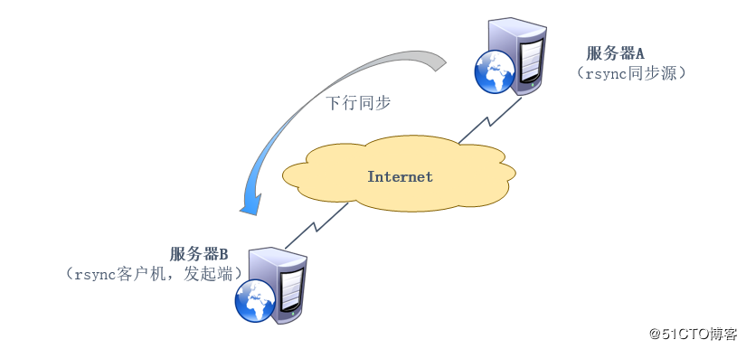 在远程同步任务中,负责发起rsync同步操作的客户机称为发起端,而负责相应来自客户机的rsync同步操作的服务器称为同步源。在同步过程中,同步源负责提供文档的原始位置,发起端应对该位置有读取权限。如图: