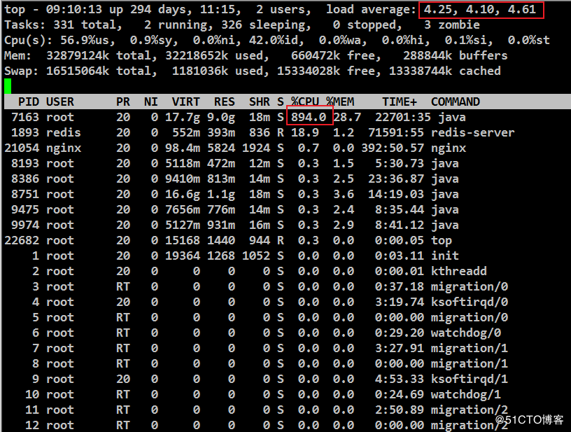 一个管理平台门户网页进统计页面提示请求超时,随进服务器操作系统检查load average超过4负载很大,PID为7163的进程占用到了800%多。