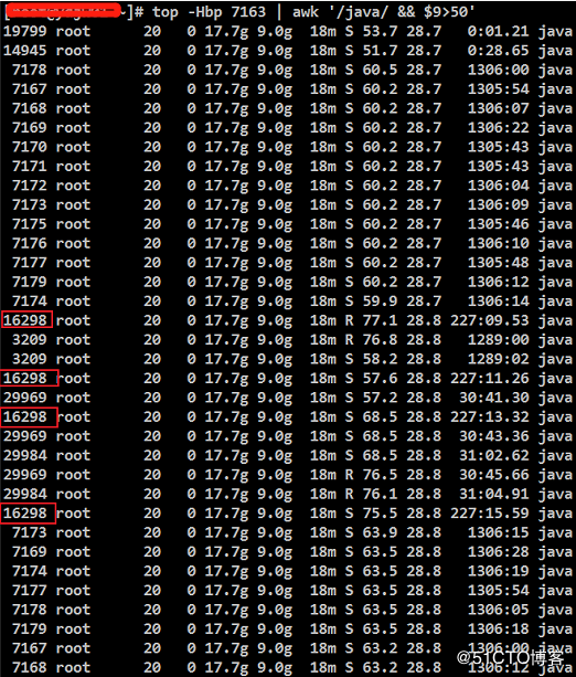 top -Hbp 7163 | awk '/java/ && $9>50'