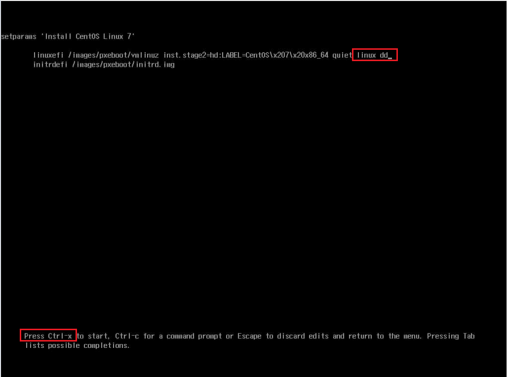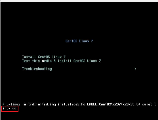 如下图选择“Install CentOS Linux7”,然后按“Tab”键添加linuxdd。