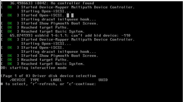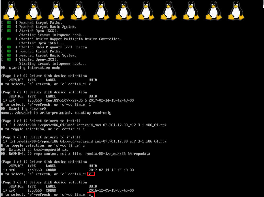 虚拟光驱弹出系统镜像,根据服务器实际配置,插入驱动ISO,如下图输入“r”回车刷新,再输入“1”回车,可看到挂载的驱动镜像,输入“1”回车选择驱动,再输入“c”回车加载驱动。