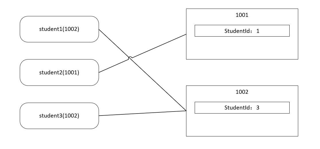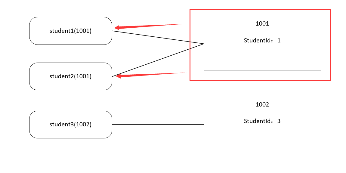 这里要注意的是变量student2和student1是没有关系的,它们只和右侧的1001有关系,只是它们地址的值是相等的。