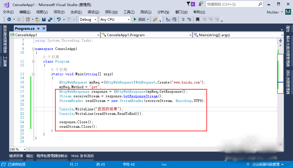 接下来我们尝试使用HttpWebRequest 来呼叫百度的首页