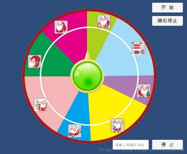 关于Unity的旋转,主要有下面几类接口:Transform.Rotate(), Transform.RotateAround(),Transform.rotation, Transform.eulerAngles。 其中 Rotate() 和 RotateAround() 都是同一类接口(里面的具体重载这里就不细说了),都是指从当前位置做指定角度的偏移,而 rotation 和 eulerAngles 都是直接赋值的字段,rotation 是一个四元数类型, eulerAngles 则是一个欧拉角。很显然,我们在做旋转的时候不需要关心具体角度,使用 Rotate() 类型做定帧偏移是最合适的,通过设置偏移的角度就能实现变速转动,比较适合转盘开始阶段的加速过程和中间的匀速过程,而当我们知道停止的具体角度时,则可已利用差值运算能精准地实现减速过程并最终停到我们需要的位置。但是有一点需要注意,Unity里面角度是逆时针计算的,而我们日常生活中一般习惯于顺时针,所以,最终的角度还需要取反一下。废话不多说,见代码: