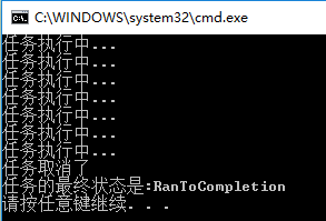 正常取消的任务最终状态是 RanToCompletion ,这里要注意的是,CancelAfter()是在这个方法调用的那一刻开始计时的(并非以Run开始计时,好吧,很好理解,我却疑惑了半天)