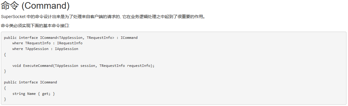 请求处理代码必须被放置于方法 "ExecuteCommand(TAppSession session, TRequestInfo requestInfo)" 之中,并且属性 "Name" 的值用于匹配接收到请求实例(requestInfo)的Key。当一个请求实例(requestInfo) 被收到时,SuperSocket 将会通过匹配请求实例(requestInfo)的Key和命令的Name的方法来查找用于处理该请求的命令