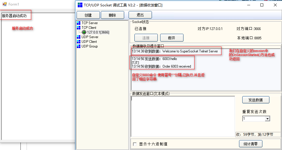 好,一个简单的,完整的自定义SuperSocket就完成了,我们运行,借助TCP/UDP Socket调试工具执行6003命令试一下