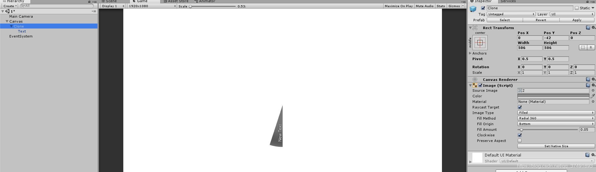 然后做一个预制体,图片就是圆形图片,image type选择filled,fill amount控制这个图片的面积大小,同时也是该图片的概率,Text组件是该奖品的名称。