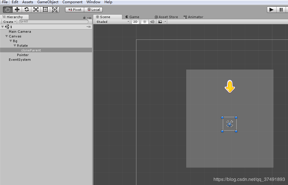 Bg就是那个灰色的图片,Rotate是个空物体,用来挂在脚本的(DialRotate.cs和Slot.cs),cloneParent也是个空物体,作为预制体的父物体,要注意的是cloneParent中心那个蓝色的圆圈要和Rotate的蓝色的圈的位置一致,界面布局工作完成。