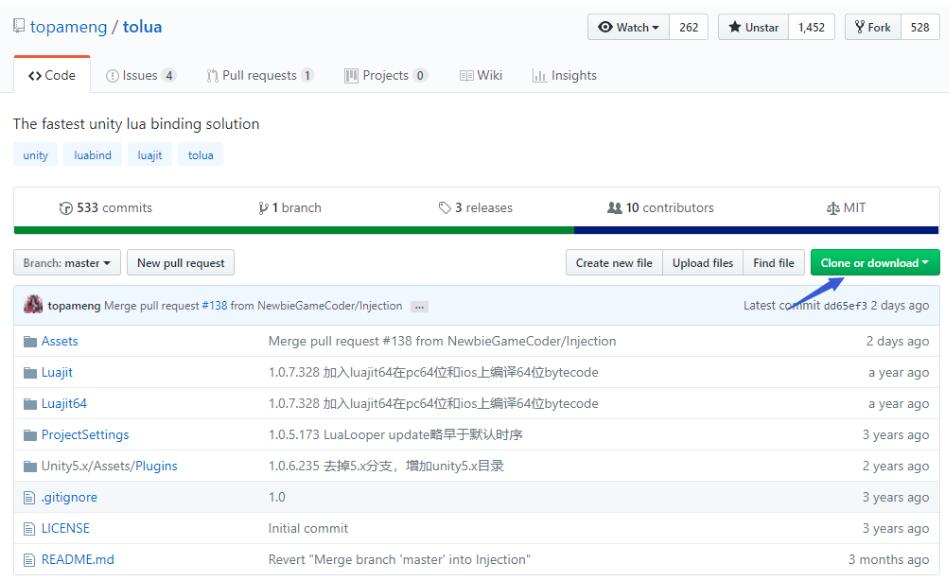 这是作者的github地址,进入以后点击下载zip,完成后解压到自己需要的目录,再用unity打开即可。