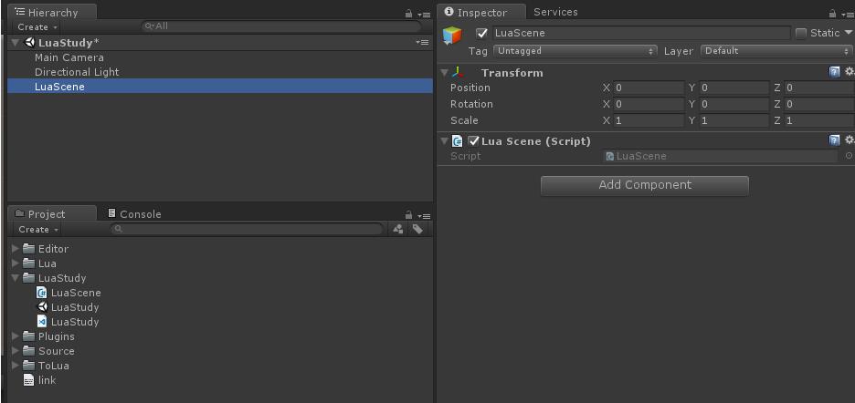 tolua虚拟机的创建非常简单,只需要new一个luastate即可,我们建立一个c#脚本作为入口,引用luainterface命名空间,输入以下代码,将文件挂载到场景中的一个空物体上即可。
