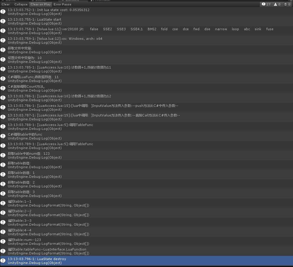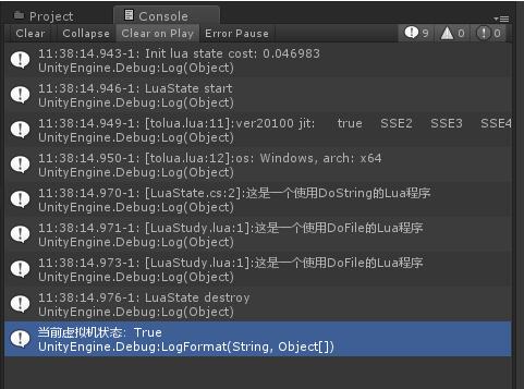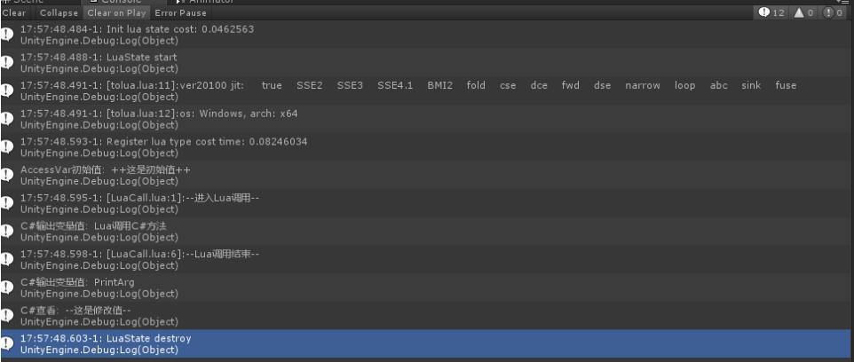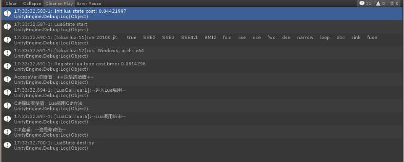 成功运行,说明tolua实现了一整套绑定方案,只需要将所需要的内容配置完成即可。