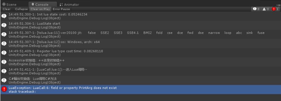 我在lua中加入了一行access:printarg("printarg")调用方法,发现unity报了这样的错误: