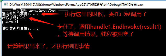 但是问题依然存在,当主线程运行到endinvoke时,如果这时调用没有结束(这种情况很可能出现),这时为了等待调用结果,线程依旧会被阻塞。