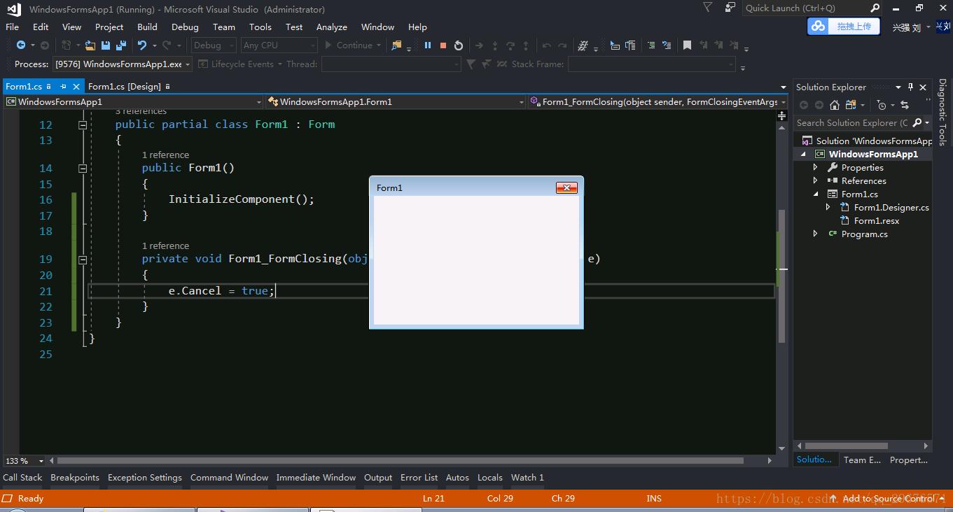 方法二:就是在窗口的formclosing事件中加上这样一句话就可以了