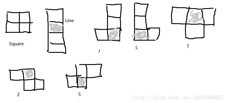 在充分分析游戏的特点后,游戏大概可以分为3个类:square 小正方形,block 由4个小正方形组合成的一个图形, gamefield 游戏的驱动引擎