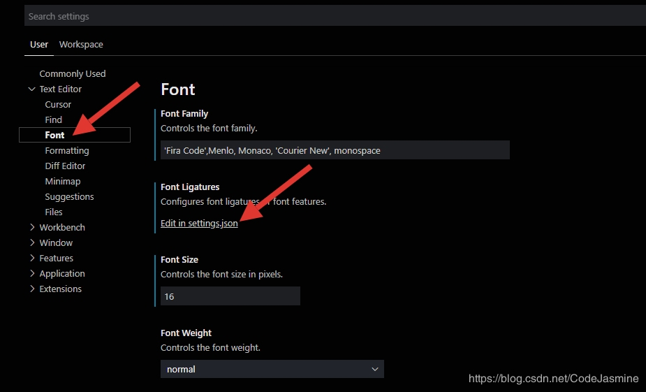 根据上图箭头所示依次点击font,edit in settings.json,添加如下代码: