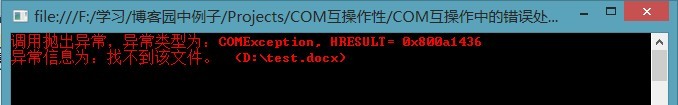 知道了如何调用com组件之后,大家或许会问:如果调用com对象的方法失败时怎么去获取失败的信息呢?对于这个疑问,错误的处理的方法和我们平常托管代码中的处理方式是一样的,下面就具体看看是如何获取错误信息的,下面这段代码的功能是——打开一个现有的word文档并插入相应的文本,当指定的word文档不存在时,此时就会出现调用com对象的open方法失败的情况,具体代码如下: