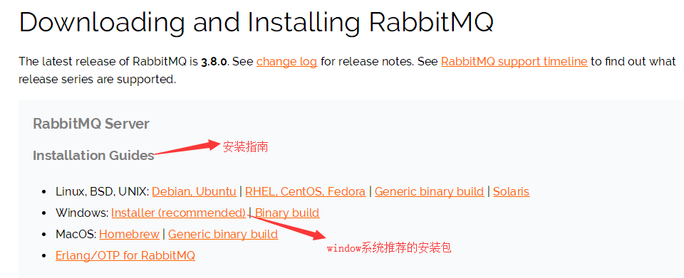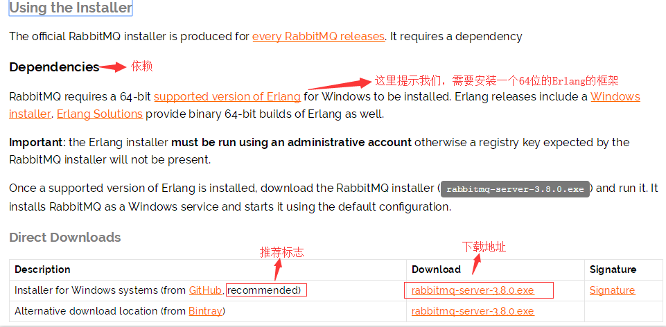 除了下载安装包,我们还会发现,在【using the official installer】段落里,有提醒我们,rabbitmq是有依赖的,依赖一个erlang语言的框架(类似于c#语言的netframework)。