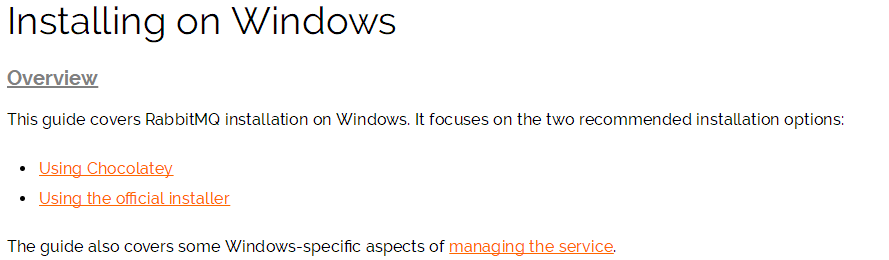 在预览里,我们得知,安装rabbitmq有两种方法,一种是使用chocolatey安装,一种是使用官方安装包安装。