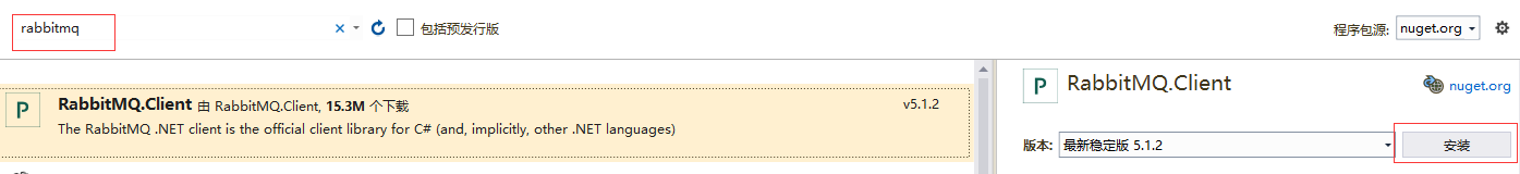 在c#里使用rabbitmq开源类库非常简单,可以去官网下载一个.net版本的rabbitmq客户端类库,也可以直接在nuget上搜索rabbitmq,然后安装,如下图: