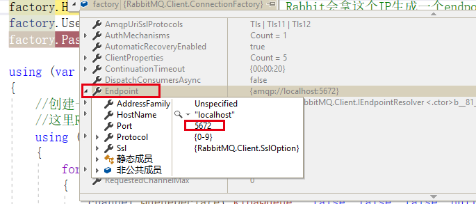factory.hostname = "localhost";//主机名,rabbit会拿这个ip生成一个endpoint,这个很熟悉吧,就是socket绑定的那个终结点。