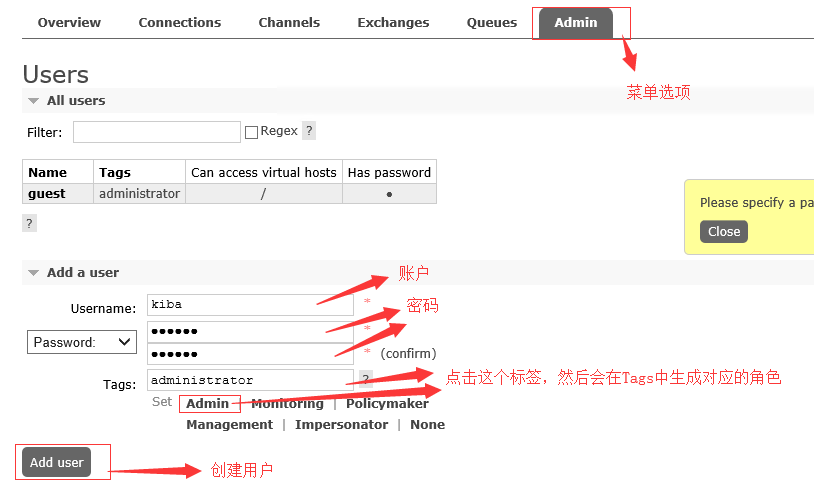 点击菜单栏的admin选项,进入用户管理界面创建用户kiba,密码123456,如下图: