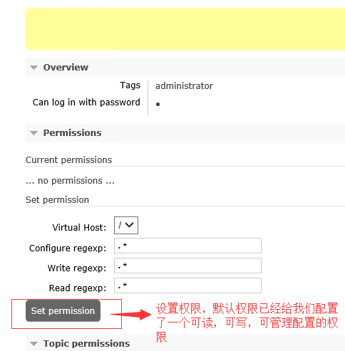如上图所示,页面默认为我们设置了一个可读,可写,可管理配置的权限;所以,我们只要点击set premission就可以了。