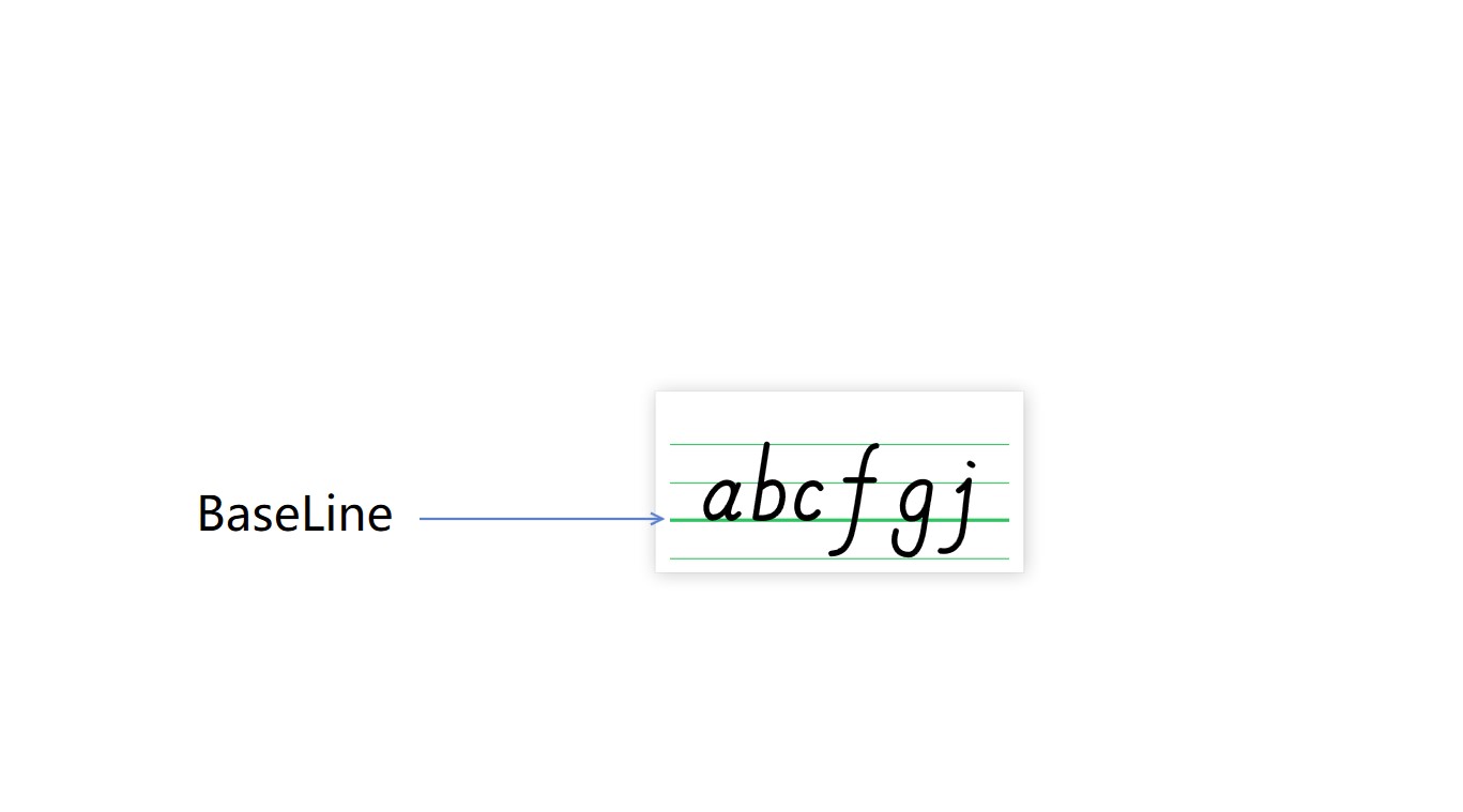 可以看到文本是从 100,100 作为左上角的基线 BaseLine 开始绘制的。这里需要科普文本的 基线 BaseLine 是什么。其实大家学英语到知道四线三格吧,如下图,第三条线就是 BaseLine 基线