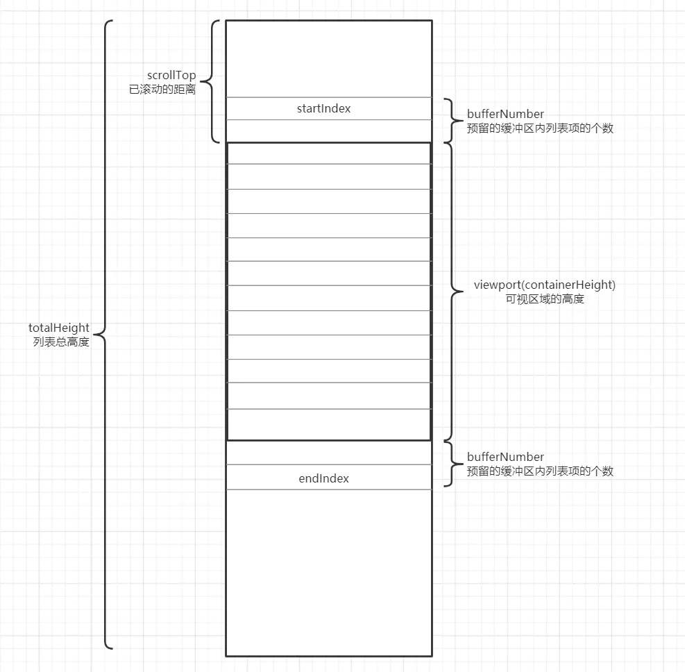 有一小部分帅气(漂亮)的小伙伴可能就会问了,那一直滚动一直加载,后面不会很卡吗?答案是不会的,上面说到“只渲染可视区域的列表项,非可见区域的 完全不渲染”,而一般是渲染3屏或者3页数据,也就是说,除了这3个,其余的统统不渲染,通俗点来说就是看不见它就删掉它,这样在页面中,就永远最多只会渲染3页数据,除非你一行的数据量页极大,不然不会出现卡顿的情况,请小伙伴们放心!形象点请看下图: