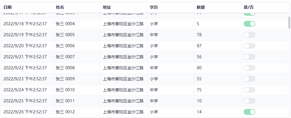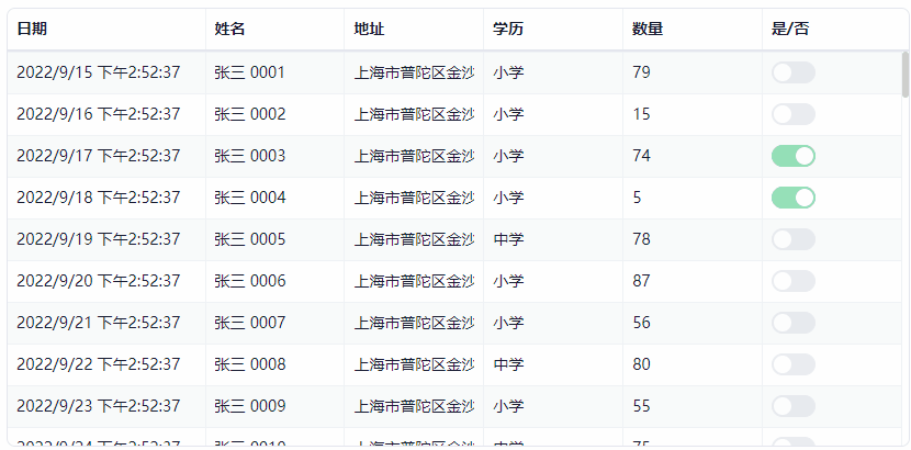 <Table TItem = "Foo" IsBordered="true" IsStriped="true" Items="Items" ScrollMode="ScrollMode.Virtual"><TableColumns><TableColumn @bind-Field="@context.DateTime" Width="180" /><TableColumn @bind-Field="@context.Name" /><TableColumn @bind-Field="@context.Address" Readonly="true" /><TableColumn @bind-Field="@context.Education" /><TableColumn @bind-Field="@context.Count" Editable="false" /><TableColumn @bind-Field="@context.Complete" /></TableColumns></Table>