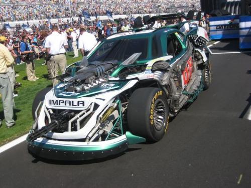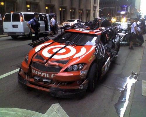 雪佛兰Impala是一款全尺寸轿车,也是美国畅销的车型之一。这款车曾也小批量的来过中国,而它在国内也有一个很好听的名字-黑羚羊。在一些美国出品的赛车游戏中,你可能会见到这款似曾相识的车,而在本部电影中,它的造型与原版比较素雅的造型完全大相径庭。电影《变形金刚3》掀起了一股“变形车”狂潮,改装赛车大受欢迎。导演在本片中汽车的造型上有了一些变化,加入了更加夺人眼球的元素。来自雪佛兰的Impala赛车版,不过它是经过了真正的改装的车,看看尾部硕大的喷气孔就可见它的动力会有多么骇人了