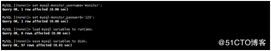 MySQL [(none)]> set mysql-monitor_username='monitor'; MySQL [(none)]> set mysql-monitor_password='123'; MySQL [(none)]> load mysql variables to runtime; MySQL [(none)]> save mysql variables to disk;