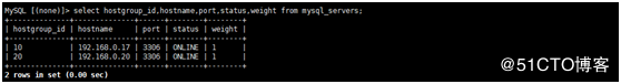 MySQL> select hostgroup_id,hostname,port,status,weight from mysql_servers;