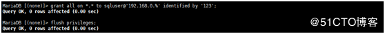 MariaDB [(none)]> flush privileges; MariaDB [(none)]> grant all on *.* to sqluser@'192.168.0.%' identified by '123'; MariaDB [(none)]> flush privileges;