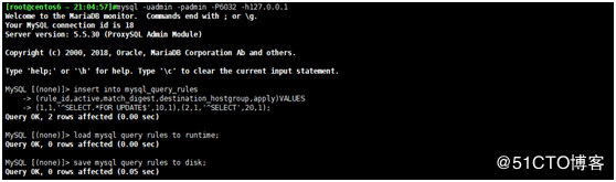 MySQL> insert into mysql_query_rules (rule_id,active,match_digest,destination_hostgroup,apply)VALUES (1,1,'^SELECT.*FOR UPDATE$',10,1),(2,1,'^SELECT',20,1); MySQL> load mysql query rules to runtime; MySQL> save mysql query rules to disk;