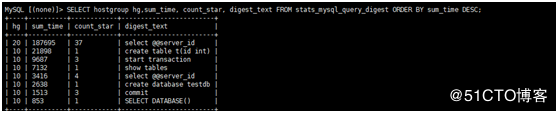 mysql -usqluser -pmagedu -P6033 -h127.0.0.1 -e 'start transaction;select @@server_id;commit;select @@server_id' 路由的信息:查询stats库中的stats_mysql_query_digest表 MySQL > SELECT hostgroup hg,sum_time, count_star, digest_text FROM stats_mysql_query_digest ORDER BY sum_time DESC;