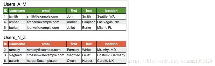 3、前面垂直拆分的用户表如果进行水平拆分,结果是: